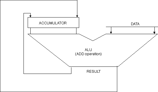 We can see how multiple bytes of data can be added together using the structure below. The sequencing circuitry is not shown. The ALU is programmed to perform an ADD operation (in this case) and if successive bytes are presented at the data port, then the accumulative total is held in the ACCUMULATOR register. In a practical system, some means of storing overflows (i.e. the carry bits) will be required.