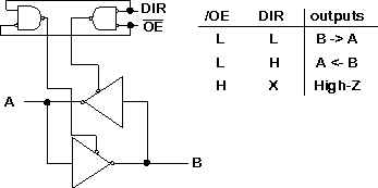 In this example, both buffers can be tri-stated and the direction of data flow is determined by the DIR input. This input will be connected to the R/W line (see later) from the microprocessor.